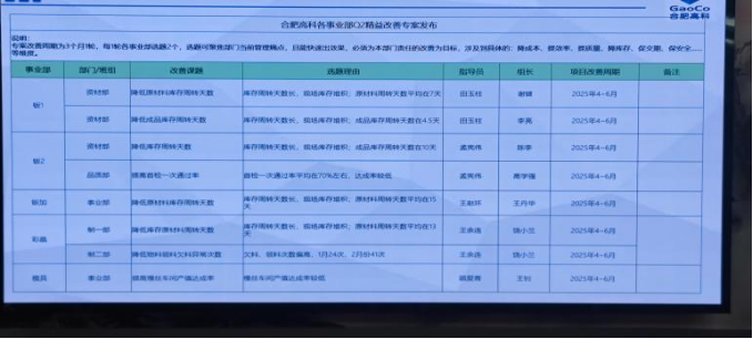 為深化精益理念,合肥高科創(chuàng)新推出“C2精益改善專(zhuān)家”機(jī)制,以事業(yè)部為單位,圍繞“降成本、提效率、提質(zhì)量、降庫(kù)存、促交期、保安全”六大目標(biāo),制定可量化、可追蹤的改善課題。各事業(yè)部分別上臺(tái)匯報(bào)2025年第一季度精益改善專(zhuān)案的成果。