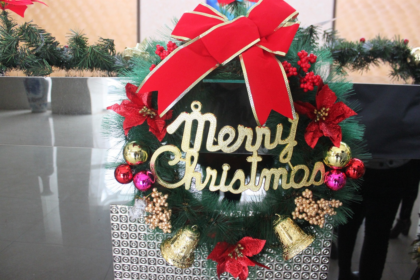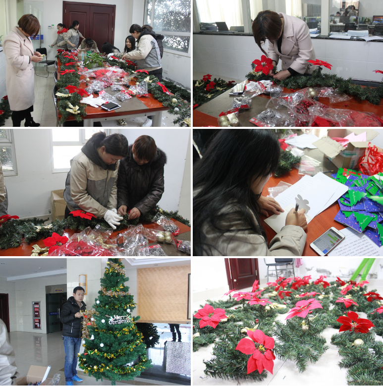 活動現場設在行政大廳,經過大家的努力,把大廳布置的非常漂亮,但前期的工作還是相當大的,寫賀卡、組裝圣誕樹等,還搭配許多裝飾。